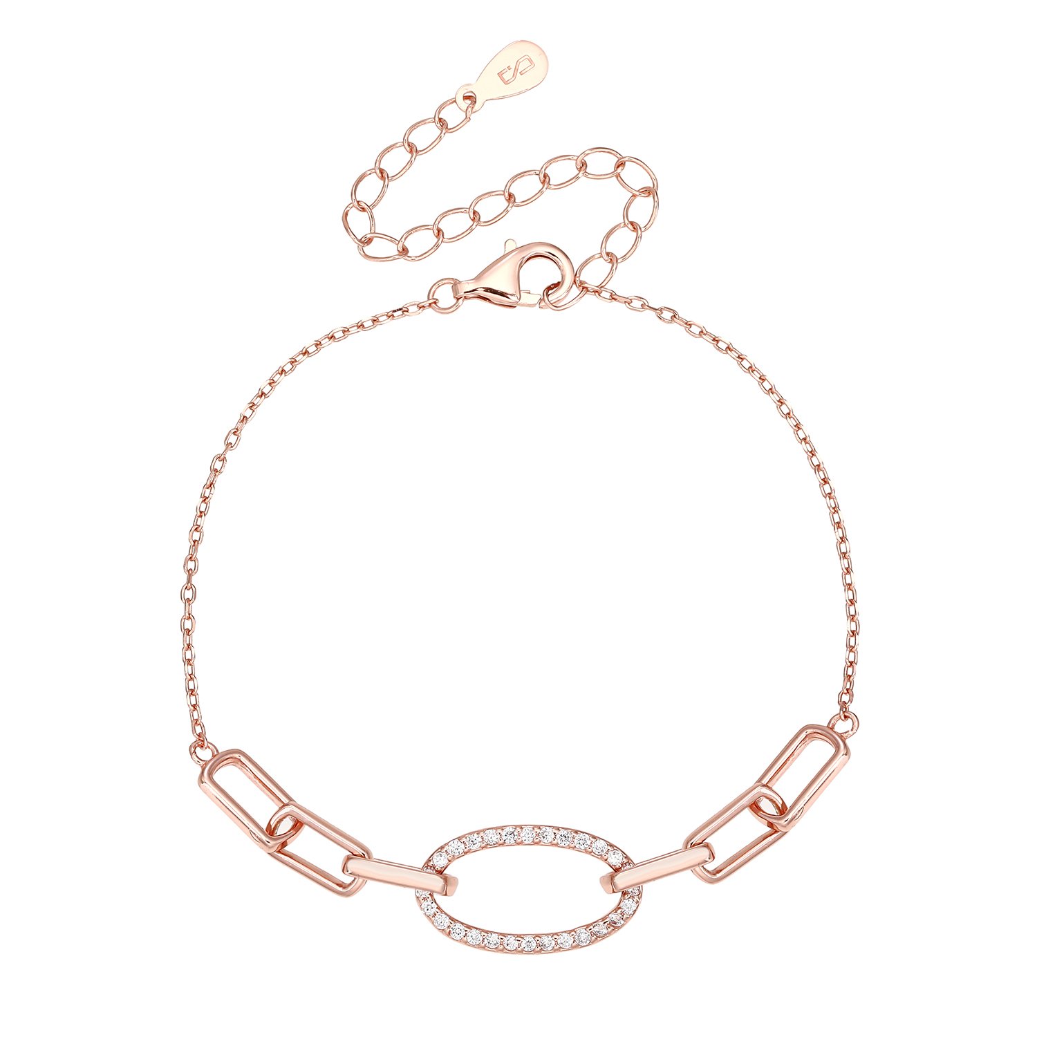צמיד Sorella משלב חוליה מרכזית אליפטית משובצת זרקונים עם חוליות דקות בציפוי רוז גולד חמים. המראה המעודן והברק היוקרתי יוצרים תכשיט נשי, אלגנטי ומלא סטייל — מושלם להוספת זוהר לכל הופעה.