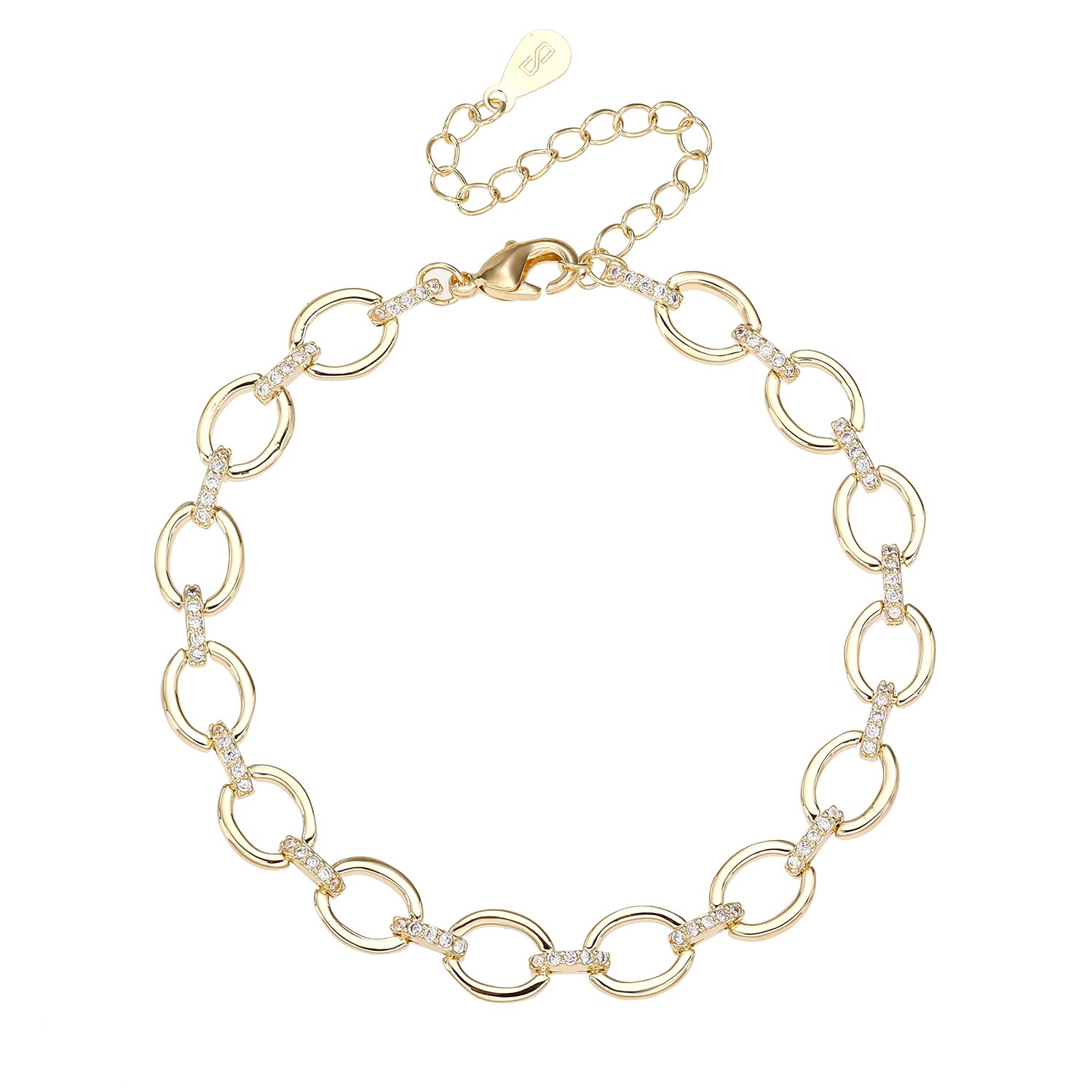 צמיד Varian בעיצוב חוליות עגולות קלאסיות, עשוי פליז בציפוי זהב 14K בעובי 2 מיקרון ומשובץ אבני זרקון נוצצות.